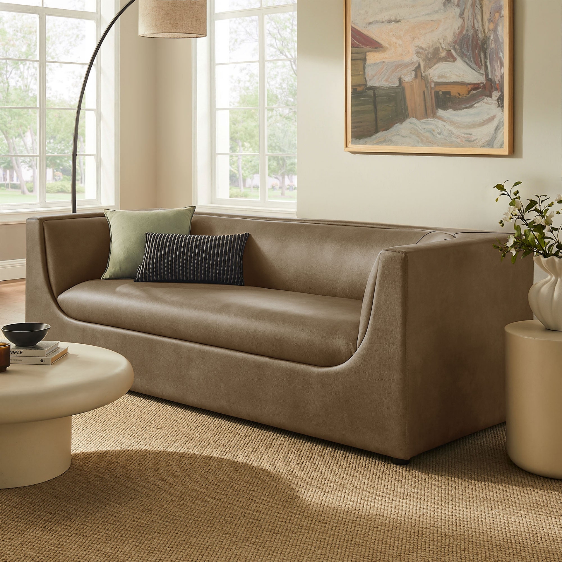 Curved Back Vegan Leather Sofa, Loveseat, Chair in Mushroom or Toast Finish
