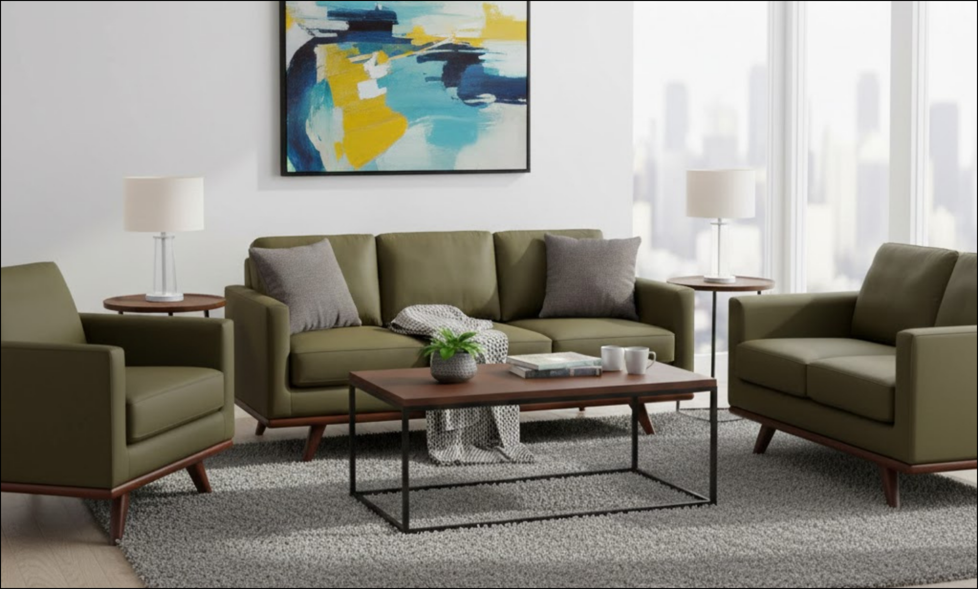 Wood Base Leather Green Sofa, Loveseat and Chair